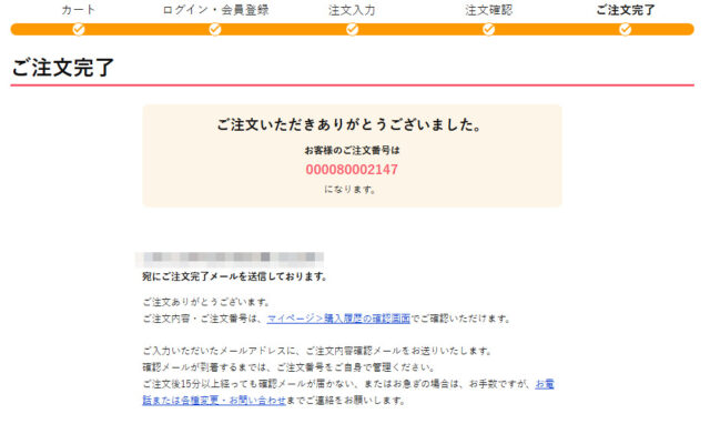 ご注文内容は、『ご注文完了メール』または、マイページの『ご注文履歴』よりご確認いただけます。