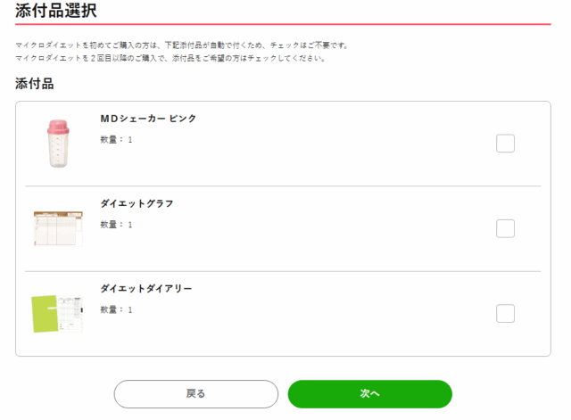 ・マイクロダイエットを2回目以降のご購入で、添付品(シェーカーピンク、ダイエットグラフ、ダイエットダイアリー)をご希望の方はチェックしてください。(初めてご購入の方は、自動で付くためチェックはご不要です。)