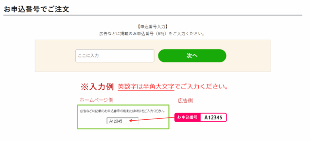 紙媒体やDMに記載の6桁の申込番号を入力の上、次に進んでください。